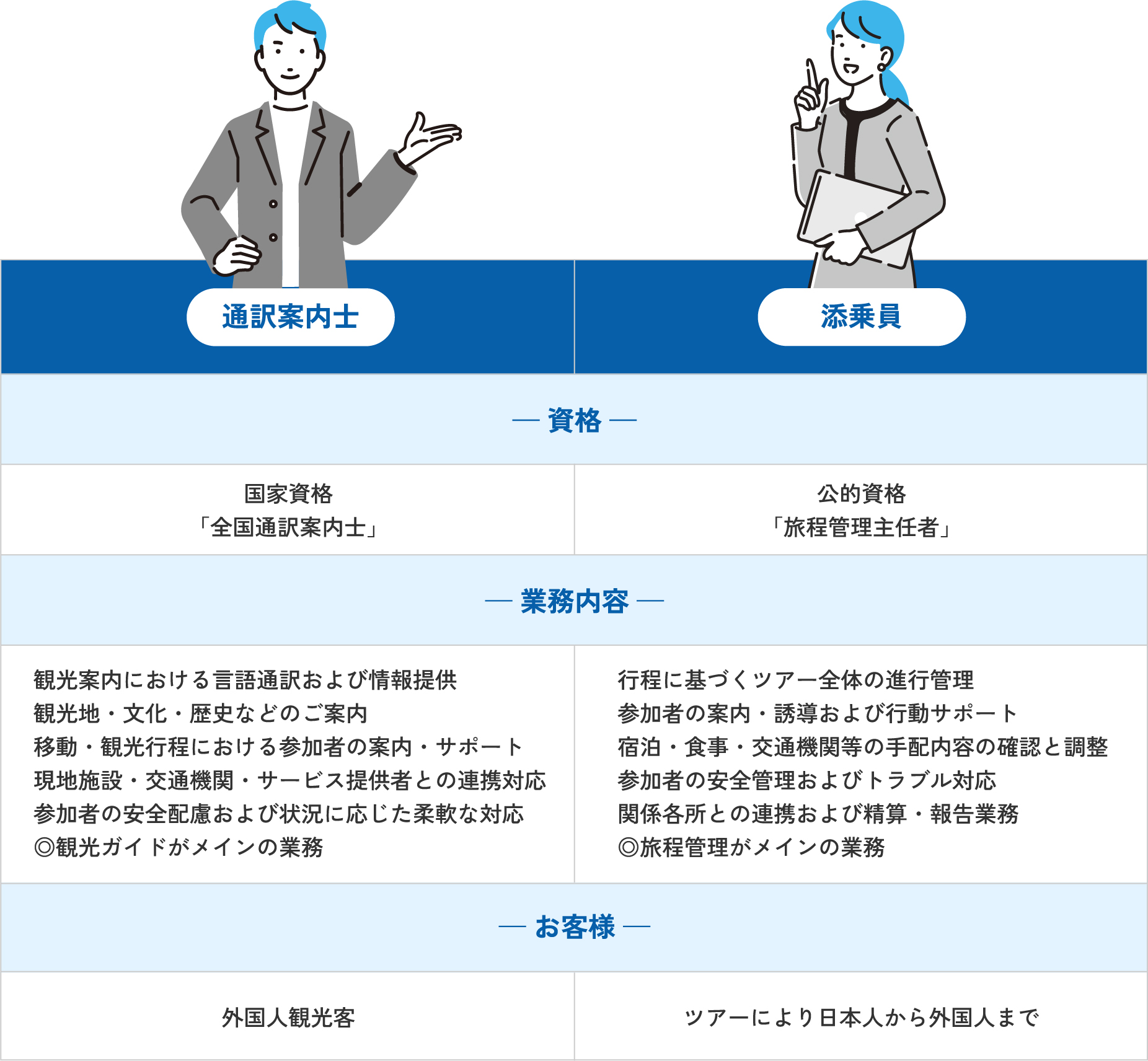 全国通訳案内士は、通訳案内士法において「報酬を得て、通訳案内(外国人に付き添い、外国語を用いて、旅行に関する案内をすることをいう。)を業とする。」とされています。全国通訳案内士は国家試験に合格した方であって、高度な外国語能力や日本全国の歴史・地理・文化等の観光に関する質の高い知識を有する者であり、「全国通訳案内士」として都道府県の登録を受けた方々になります。