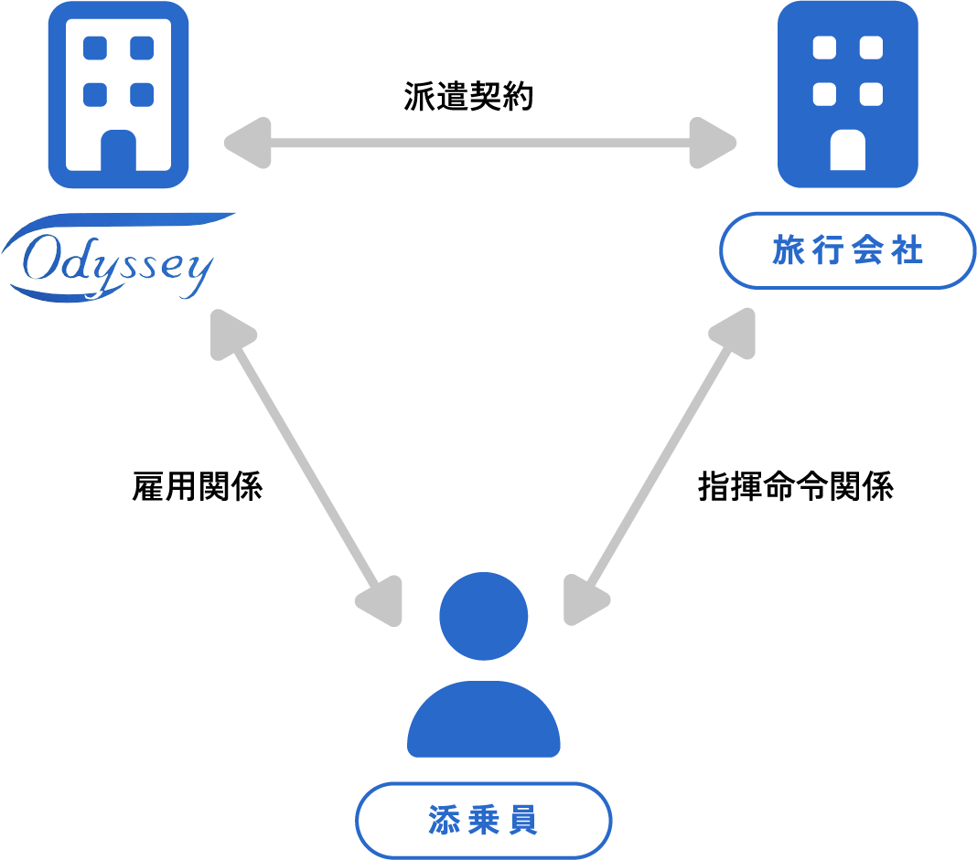 添乗派遣会社は添乗員との間に雇用関係を結び、旅行会社との間に派遣契約を結びます。添乗員派遣は派遣会社と旅行会社の間で結ぶ添乗員派遣契約に基づいて行われます。派遣された添乗員は、旅行会社の指揮命令のもとに仕事をします。